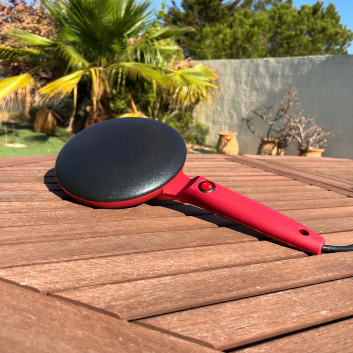 Basta accendere l’interruttore, aspettare pochi secondi che la piastra raggiunga la temperatura, immergerla nella pastella e sollevare: la crêpe si cuoce da sola in modo uniforme.